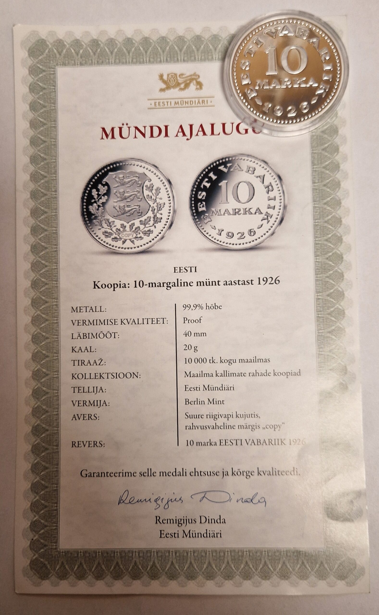 10- margiline münt aastast 1926 KOOPIA kogus